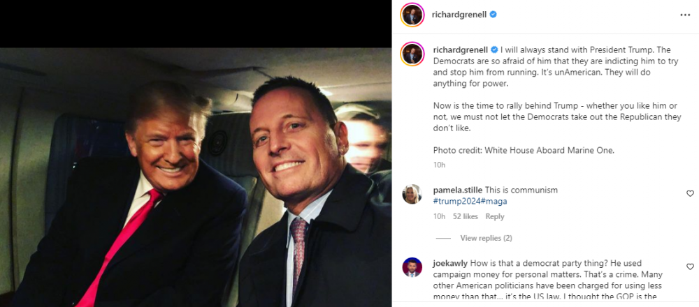 “Unë do të qëndroj gjithmonë me Presidentin Trump. Demokratët janë aq të frikësuar prej tij sa po e akuzojnë atë që të përpiqen ta ndalojnë të kandidojë. Është joamerikane. Ata do të bëjnë gjithçka për pushtet”, ka shkruar Grenell.
