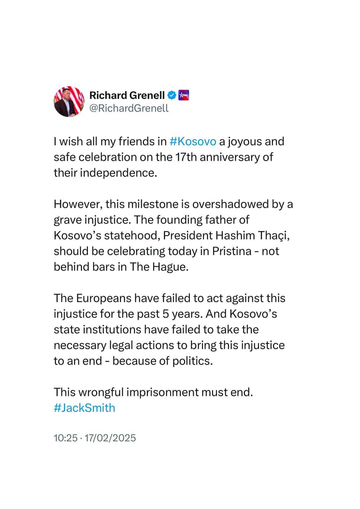 Emisari i Posaçëm për Misione të Posaçme i ShBA-së, Richard Grenell, ka uruar ditën e Pavarësisë së Kosovës, duke shprehur shqetësim për “padrejtësinë e madhe” që Hashim Thaçi, ish-Presidenti i vendit, mbetet në paraburgim në pamundësi për të festuar.