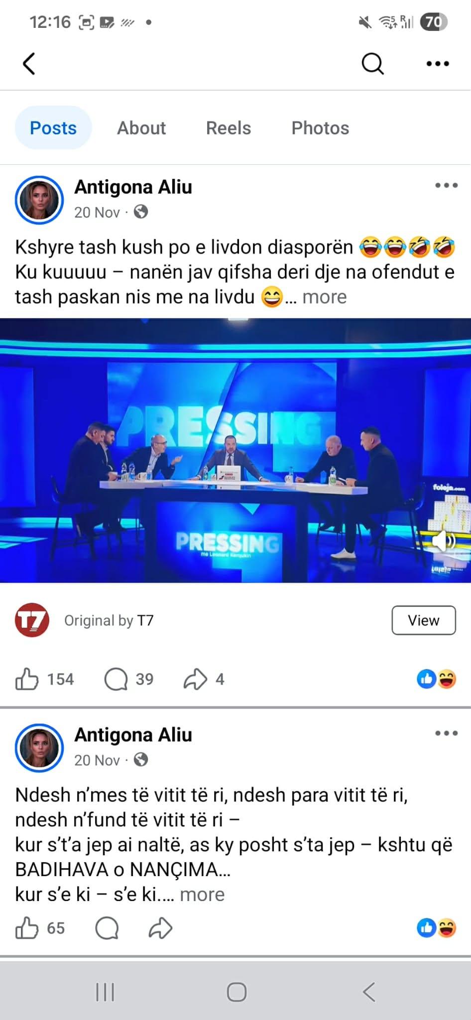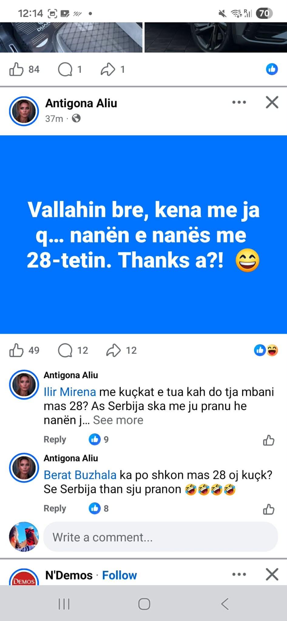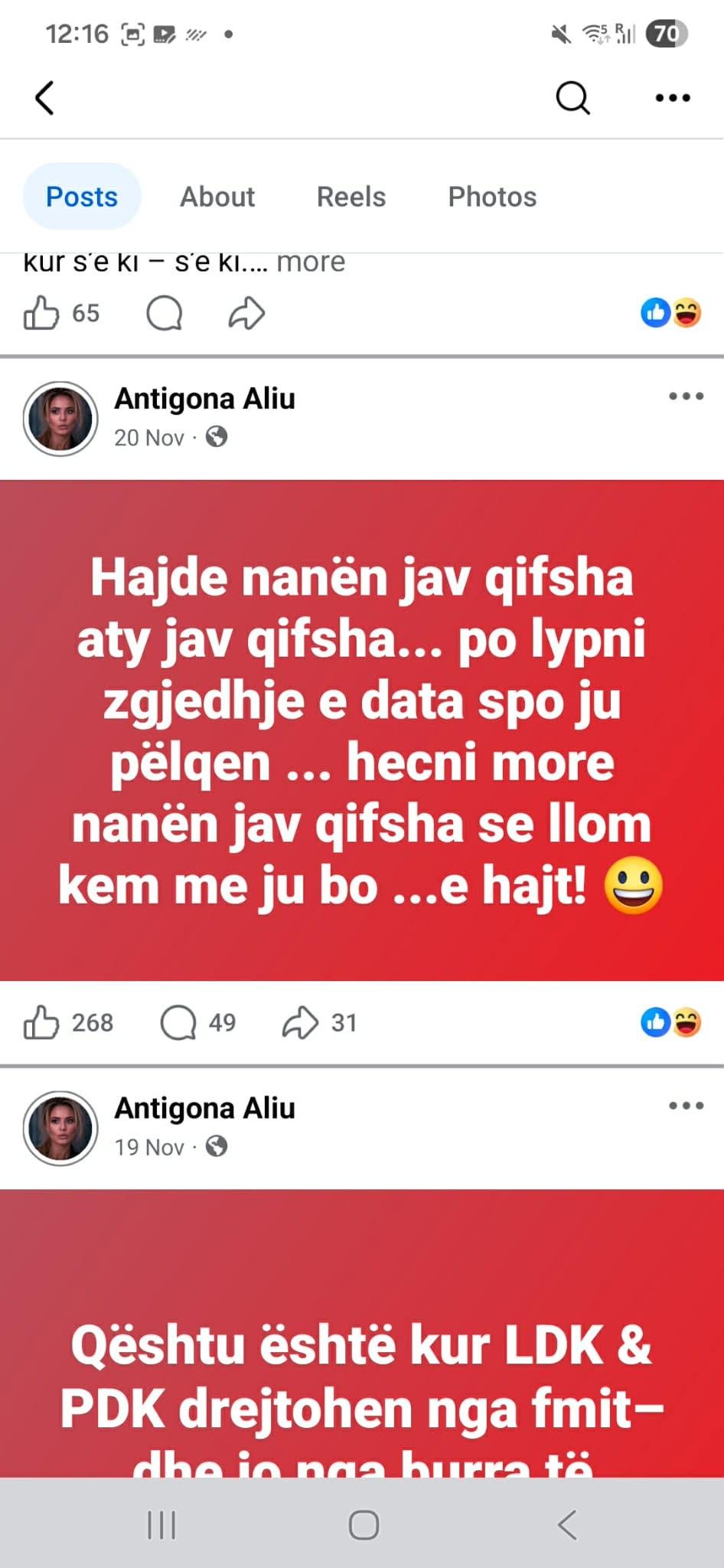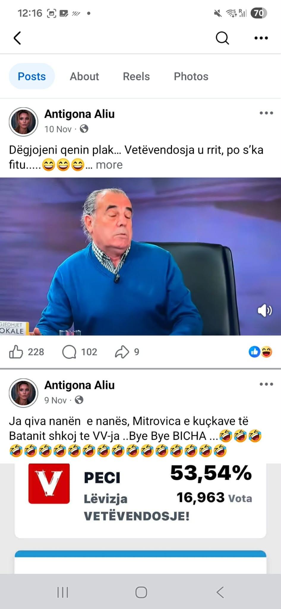 Motra e Luan Aliut të Vetëvendosjes, i cili ishte edhe deputet i Vetëvendosjes në mandatin e kaluar, Antigona Aliu, në mbrojtje të Vetëvendosjes, e duke kërkuar mbështejtje për Luanin, shanë, denigron, publikisht në mënyrë të pabesueshme, secilin folës; politikanë, gazetarë, analist. Kushdo që shpreh një mendim të lirë në lidhje me proceset politike në vend, ajo e denigron publikisht, duke komentuar çdo ditë me sharje e fyerje nëpër portale e kudo ku prezenca online është e qasshme, gjithmonë me “q***”.