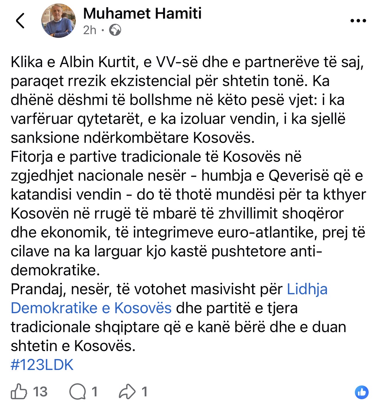 “Klika e Albin Kurtit, e VV-së dhe e partnerëve të saj, paraqet rrezik ekzistencial për shtetin tonë. Ka dhënë dëshmi të bollshme në këto pesë vjet: i ka varfëruar qytetarët, e ka izoluar vendin, i ka sjellë sanksione ndërkombëtare Kosovës. Fitorja e partive tradicionale të Kosovës në zgjedhjet nacionale nesër – humbja e Qeverisë që e katandisi vendin – do të thotë mundësi për ta kthyer Kosovën në rrugë të mbarë të zhvillimit shoqëror dhe ekonomik, të integrimeve euro-atlantike, prej të cilave na ka larguar kjo kastë pushtetore anti-demokratike. Prandaj, nesër, të votohet masivisht për Lidhja Demokratike e Kosovës dhe partitë e tjera tradicionale shqiptare që e kanë bërë dhe e duan shtetin e Kosovës”, ka shkruar Hamiti.