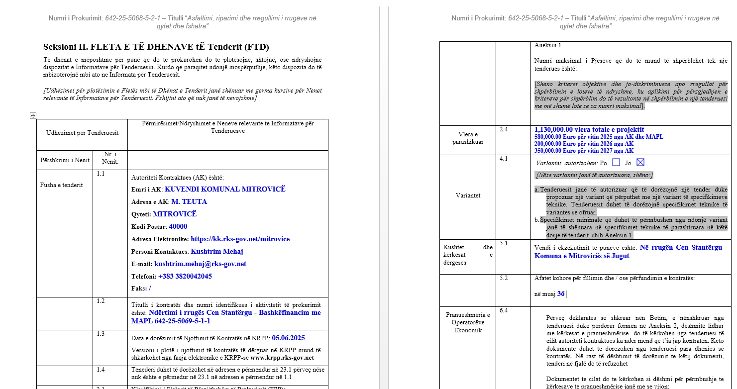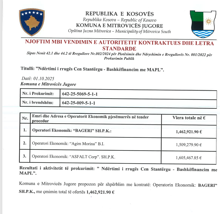 Njoftimi nga Komuna e Mitrovicës për shpalljen fitues të “Bageri” Sh.P.K. për ndërtimin e rrugën “Cen Stantërgu” në Mitrovicë është bërë më 1 tetor 2025, i cili këtë tender e ka fituar me vlerë ofertuese prej 1 milion e 462 mijë 921 euro.