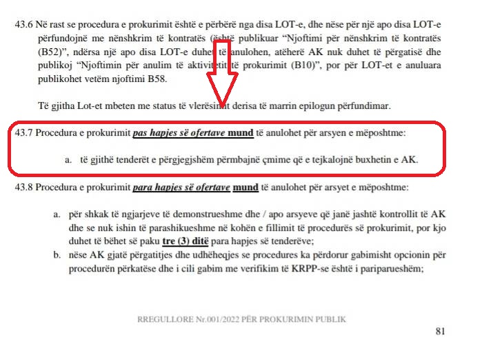 43.7 Procedura e prokurimit pas hapjes së ofertave mund të anulohet për arsyen e mëposhtme: