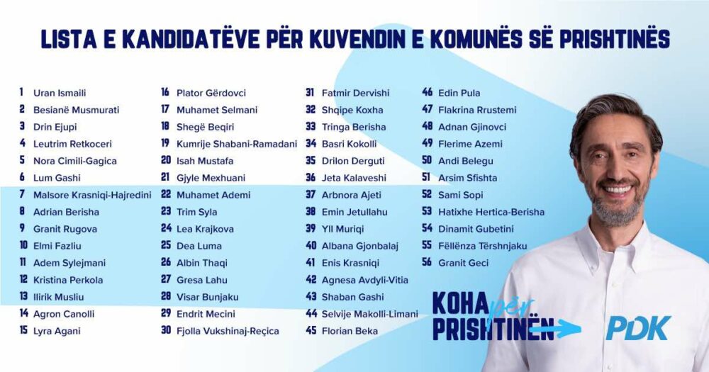 Kandidati për kryetar të Prishtinës, Uran Ismaili, ka prezantuar listën e 56 kandidatëve të PDK-së për Asamble Komunale të Prishtinës.