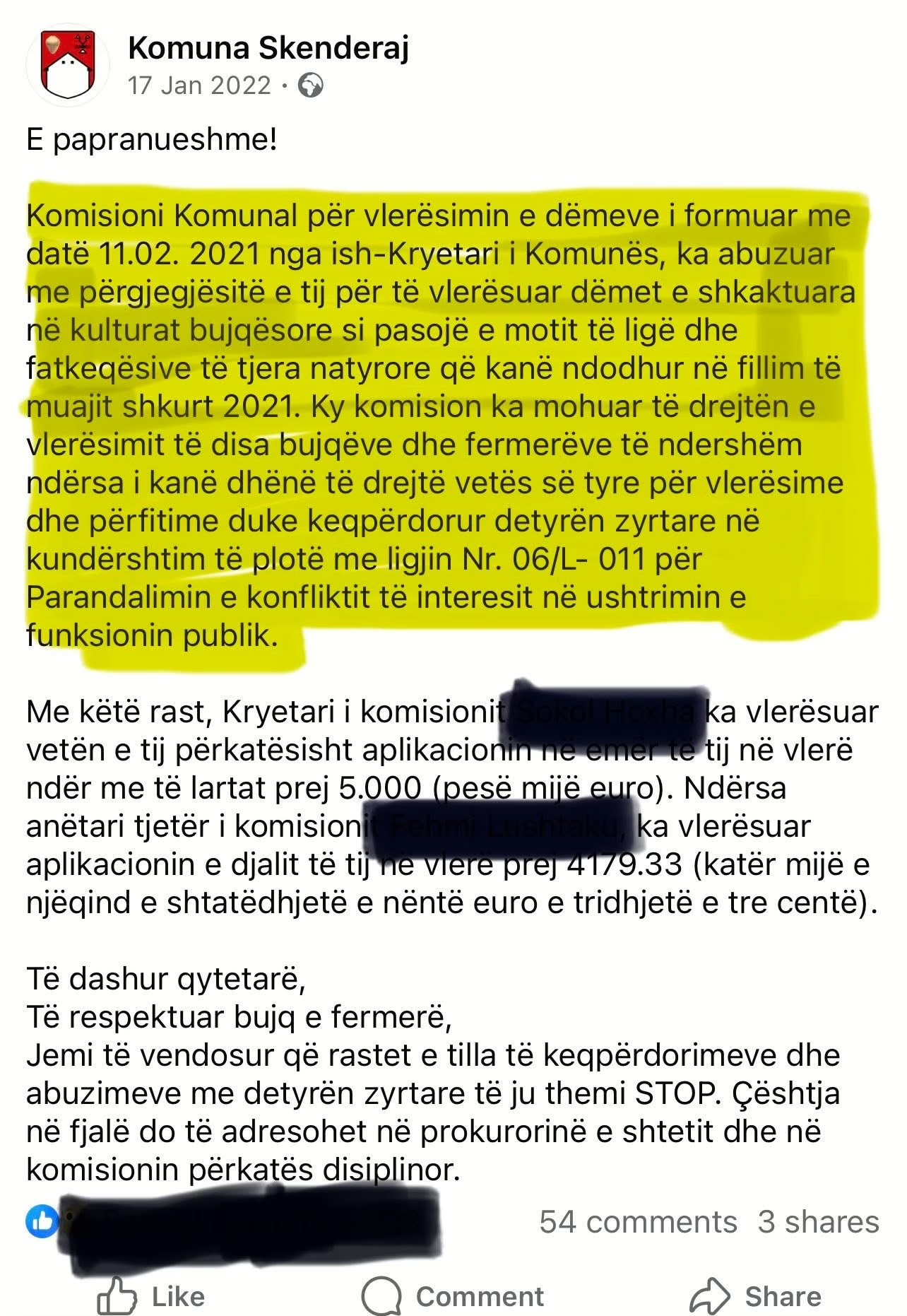 Në reagimin që e kishte bërë në faqe të komunës, Samiu, zotohei para fermerëve dhe qytetarëve se rasteve të tilla të keqpërdorimeve do t’ju thonte STOP. E se rastin do ta dërgonte në prokurorinë e shtetit.