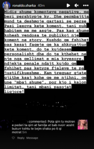 Pas kaq shumë kohësh vendosa të publikoj një koment në story. Kushdo që fshihet pas kësaj faqeje që ka shkruar këtë koment, do të kujdesem personalisht dhe do të kthehet në një nga qëllimet e mia kryesore, ndjekja penale ndaj kujtdo që fshihet pas këtyre fjalëve të pa justifikueshme.
