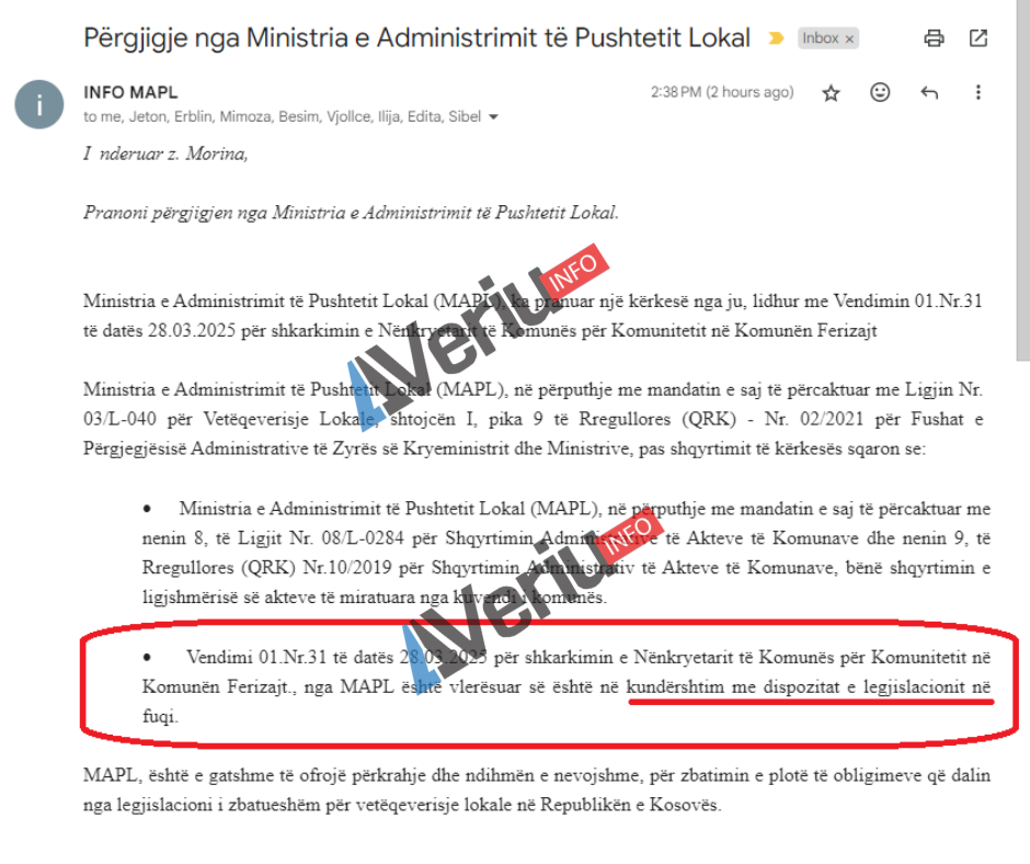 “Vendimi 01.Nr.31 të datës 28.03.2025 për shkarkimin e Nënkryetarit të Komunës për Komunitetit në Komunën Ferizajt., nga MAPL është vlerësuar së është në kundërshtim me dispozitat e legjislacionit në fuqi”, thuhej ndër të tjera në përgjigjen e MAPL-së për Veriu.info.