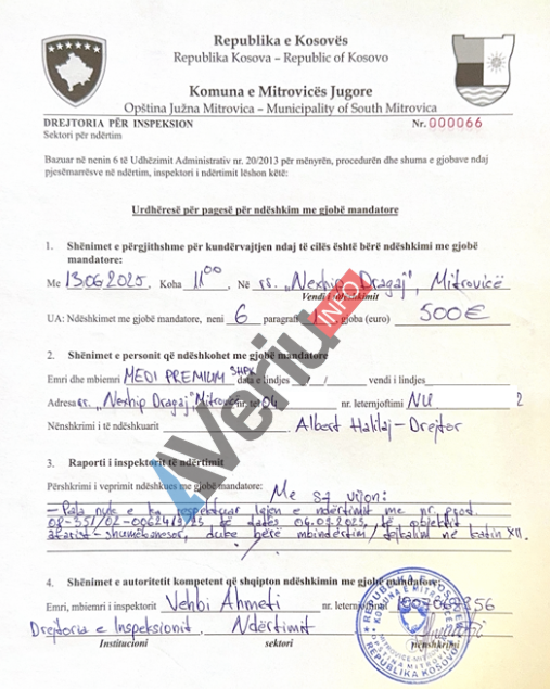 Po ashtu Veriu.info ka siguruar edhe gjobën e shqiptuar nga Drejtoria për Inspeksion për këtë mbindërtim pa leje, ku “Medi Premium” është dënuar me 500 euro nga inspektori Vehbi Ahmeti.