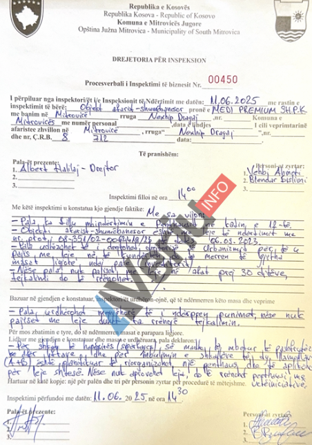 Përmes kërkesës për qasje në dokumente publike, Veriu.info ka siguruar procesverbalin e inspektimit të inspektorëve të ndërtimit në Komunën e Mitrovicës në vendpunishten e kësaj kompanie ndërtimore, ku evidentohet ndërtimi pa leje që po e bën kompania “Medi Premium” në rrugën ‘Nexhip Dragaj’ në Mitrovicë me pronar Albert Halilaj.
