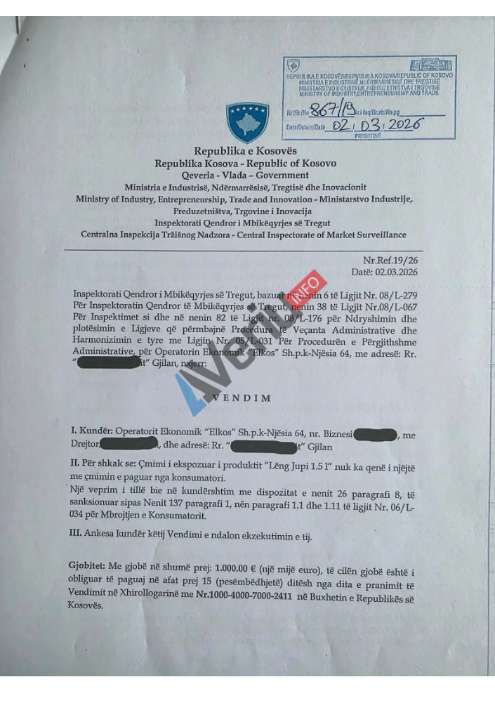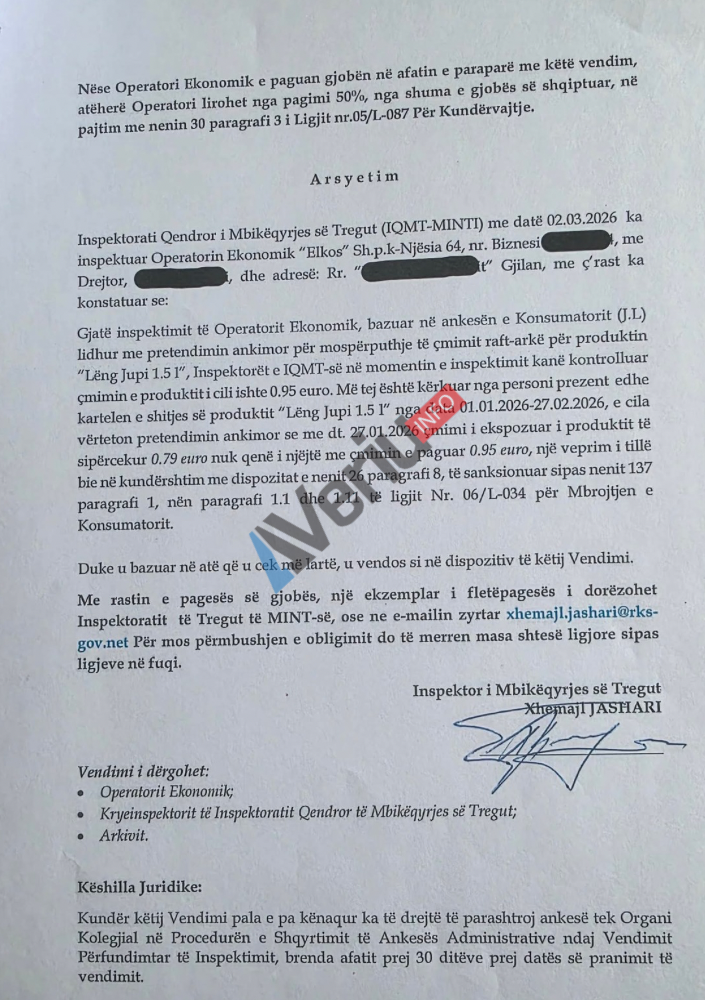 Në arsyetimin e vendimit të IQMT të Ministrisë së Industrisë, Ndërmarrësisë, Tregtisë dhe Inovacionit, bëhet e ditur se ky institucion ka realizuar inspektim në “Elkos” në Gjilan me datë 02.03.2026, ku ka gjetur se çmimi i ekspozuar i produktif “Lëng Jupi 1.5 l” më datë 27.02.2026 ka qenë 0.79 € kurse konsumatori ka paguar atë në vlerë 0.95€.