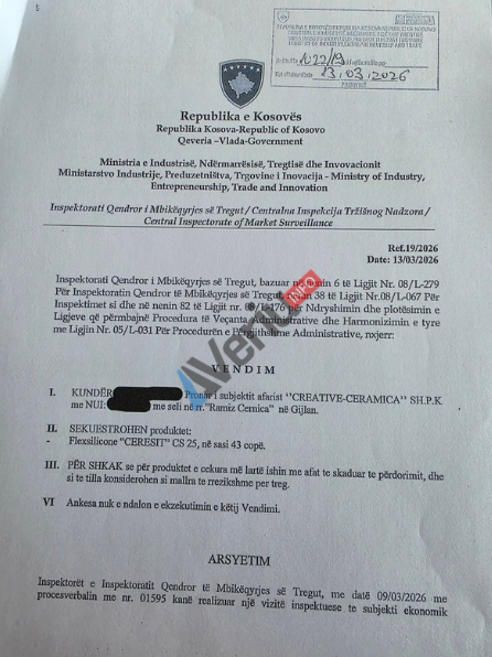 Veriu.info ka siguruar një vendim të IQMT-së të Ministrisë së Tregtisë me të cilën kompanisë Creative Ceramika me pronar Lulzim Bajrami i është sekuestruar malli për shkak të mungesës së afatit të tij.