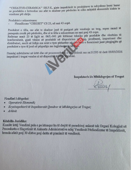 Në arsyetimin e vendimit bëhet e ditur se muajin e kaluar është realizuar një vizitë inspektuese në Creative Ceramika, gjatë së cilës është hasur në produktin Flex Silicone Ceresit me afat të skaduar.