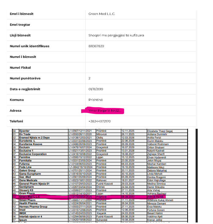 Denoncuesi pretendon se firma në fjalë ka edhe telashe me vetë licencën në Agjencinë për Produkte Medicinale. Subjekti “Green Med L.L.C.” mban licencën e depos farmaceutike me numër L1-0175, të lëshuar nga AKPPM në prill të vitit 2025.