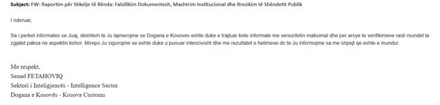 “Dogana e Kosovës është duke e trajtuar këtë informatë me seriozitetin maksimal… Ju sigurojmë se është duke u punuar intensivisht dhe me rezultatet e hetimeve do të Ju informojmë sa më shpejt,” thuhet në njoftimin e Doganës.