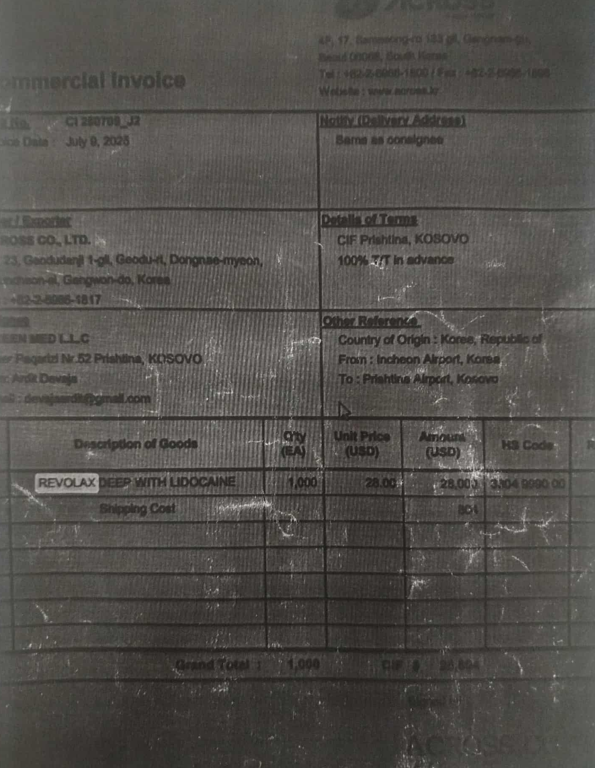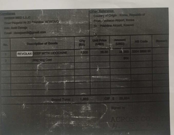 Në bazë të dokumenteve doganore (DDU) dhe faturave që posedon Veriu.info, vëllimi i importit për biznesin “Green Med L.L.C.” gjatë kësaj periudhe është si vijon: Në tërësi, gjatë viteve 2024–2025, ky biznes ka importuar 4,535 njësi të produkteve estetike dhe medicinale (1,000 njësi Revolax Deep në mars 2024 dhe 3,535 njësi serume e kremra në prill 2025), me një vlerë totale të deklaruar prej mbi 35,000 eurosh, mall ky që ka hyrë në Kosovë me dokumentacion që tashmë po hetohet nga Inteligjenca e Doganës për falsifikim të vulave dhe nënshkrimeve të prodhuesit korean.