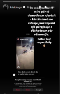 Kristi ka preferuar që këtë mesazh kërcënues ta publikojë në profilin e tij në “Instastory”, duke zgjedhur t’i përgjigjet publikisht.
