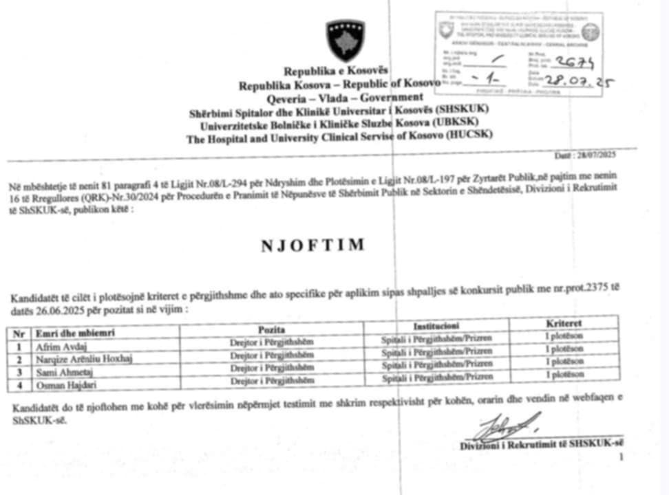 Megjithatë, me keqardhje ju njoftoj se tërhiqem dhe nuk do të jem pjesë e konkurrimit për Drejtor të Spitalit Rajonal të Prizrenit.