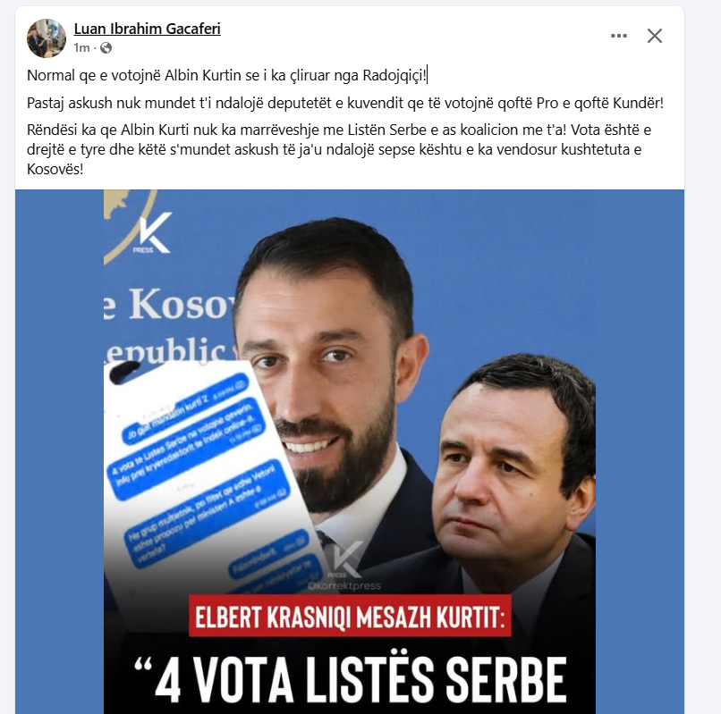 Pasi iu kapën mesazhe anëtarit të Qeverisë së Kosovës, Elbert Krasniqit, duke folur me “A.K” (Albin Kurtin) se i kanë katër vota të Listës Serbe për qeverinë e re, ka reaguar edhe kandidati i Vetëvendosjes për deputet në zgjedhjet e 9 shkurtit, Luan Gacaferri, duke shkruar se “normal që e votojnë” Albin Kurtin sepse – tash, mbajeni frymën – “i ka çliruar nga Radojçiqi”.
