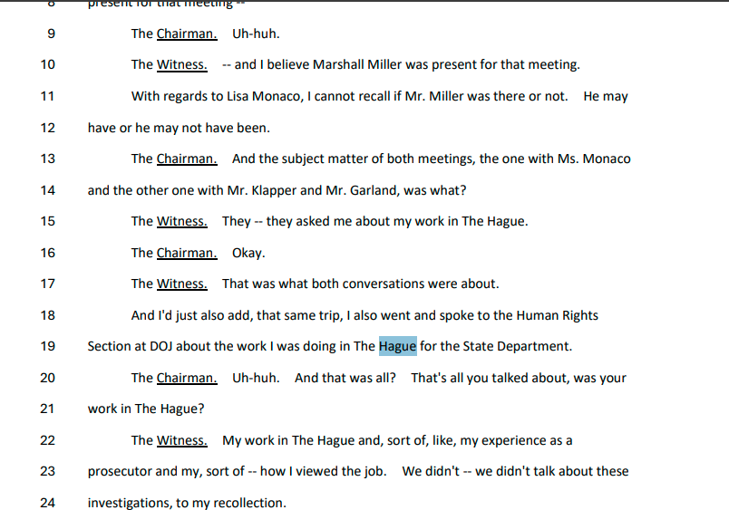Smith teksa flet për një takim që ka pasur në Departamentin e Drejtësisë në Departament të Shtetit, tregon se në disa prej bisedave zyrtarë të lartë të Departamentit të Drejtësisë e kanë pyetur rreth Hagës.