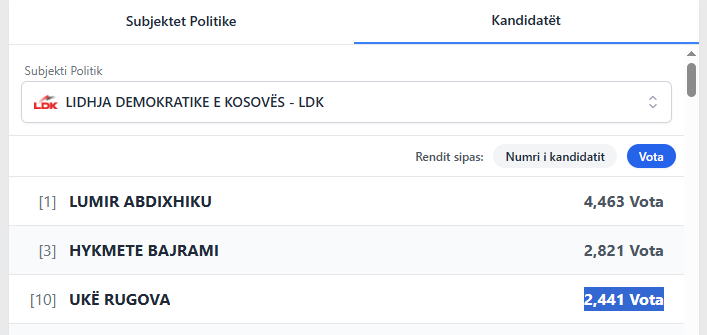 Ukë Rugova, djali i presidentit historik të Kosovës, Ibrahim Rugovës, është ndër kandidatët më të votuar të Lidhjes Demokratike të Kosovës për deputetë, kur janë numëruar 6,02% e votave.