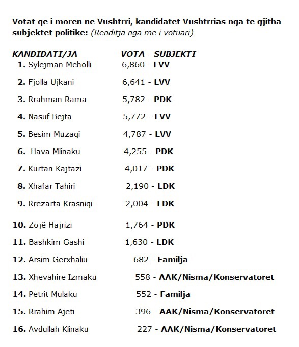 Lista vazhdon me Rrahman Ramën e PDK-së që në Vushtrri mori 5782 vota, Nasuf Bejta i LVV 5772 vota, Besim Muzaqi i LVV 4787 vota, Hava Mlinaku nga PDK 4255 vota, Kurtan Kajtazi i PDK 4017 vota, Xhafer Tahiri i LDK 2190 vota, Rrezarta Krasniqi e LDK 2004 vota.