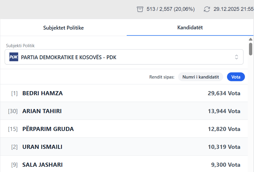Në Partinë Demokratike të Kosovës, më i votuari deri tani është Bedri Hamza me 29,634 vota.