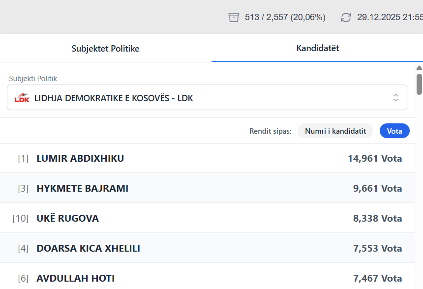 Në Lidhjen Demokratike të Kosovës, kryeson Lumir Abdixhiku me 14,961 vota.