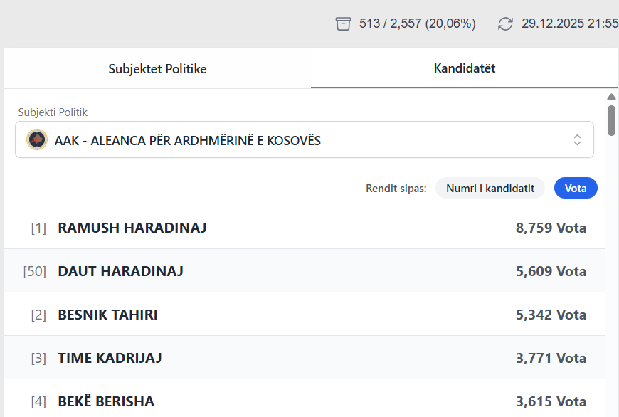 Ndërkaq, në Aleancën për Ardhmërinë e Kosovës, Ramush Haradinaj prin me 8,759 vota, i ndjekur nga Daut Haradinaj me 5,609 vota, Besnik Tahiri me 5,342, Time Kadrijaj me 3,771 dhe Bekë Berisha me 3,615 vota.