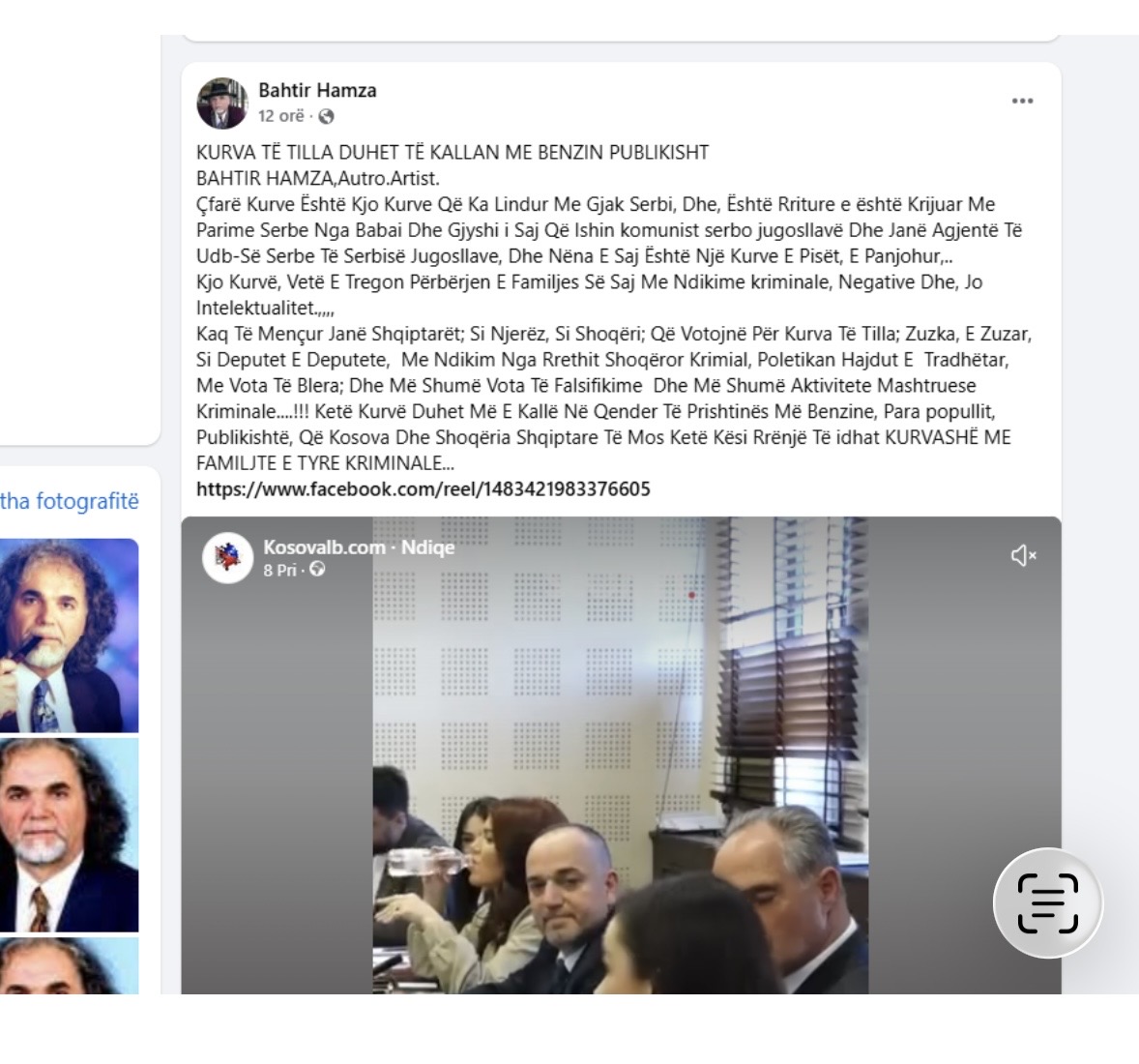 “Çfarë Kurve Është Kjo Kurve Që Ka Lindur Me Gjak Serbi, Dhe, Është Rriture e është Krijuar Me Parime Serbe Nga Babai Dhe Gjyshi i Saj Që Ishin komunist serbo jugosllavë Dhe Janë Agjentë Të Udb-Së Serbe Të Serbisë Jugosllave, Dhe Nëna E Saj Është Një Kurve E Pisët, E Panjohur,.. Kjo Kurvë, Vetë E Tregon Përbërjen E Familjes Së Saj Me Ndikime kriminale, Negative Dhe, Jo Intelektualitet”, ka shkruar ai.