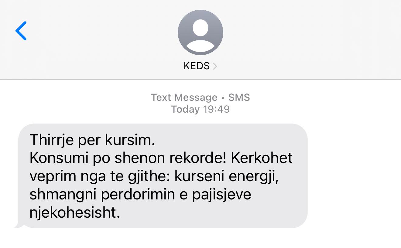 Edhe në këtë mesazh që qytetarët kanë pranuar nga KEDS, bëhet thirrje për kursim të energjisë, pasi që konsumi po shënon rekorde.
