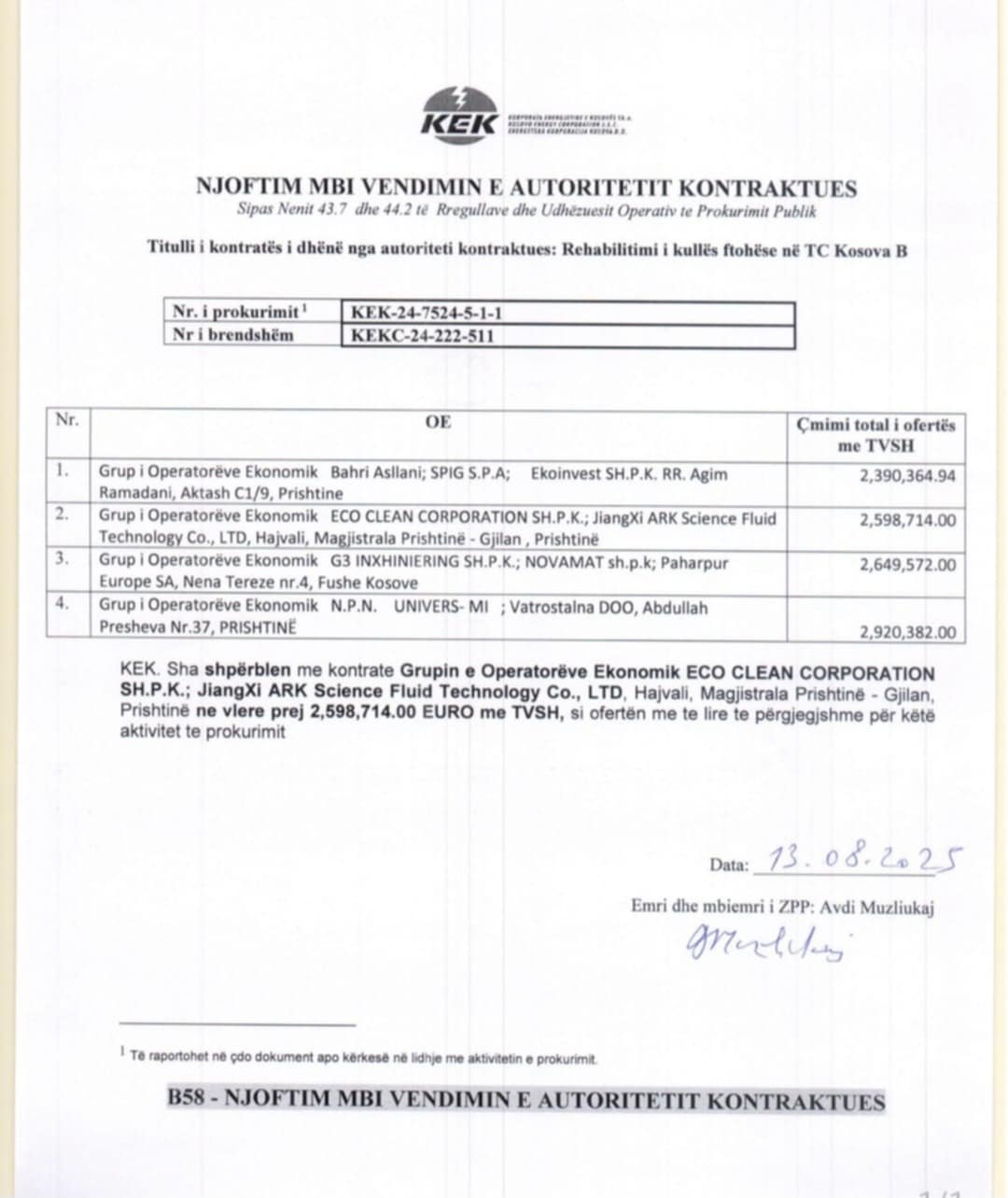 Korporata Energjetike e Kosovës (KEK), ka shpërblyer me kontratë me tender në vlerë mbi 2 milionë euro një konsorcium të përbërë nga kompania ECO CLEAN CORPORATION SH.P.K. dhe kompaninë JiangXi ARK Science Fluid Technology Co., LTD. Të dy kompanitë kanë lidhje me Kinën.