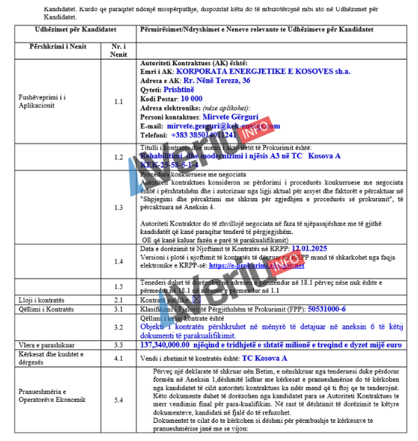 Bëhet e ditur se afati i fundit për dorëzim të aplikacioneve është data 01.04.2025, përderisa thuhet se naksimum 6 kandidatë do të ftohen për të dorëzuar tenderët e detajuar për këtë kontratë.