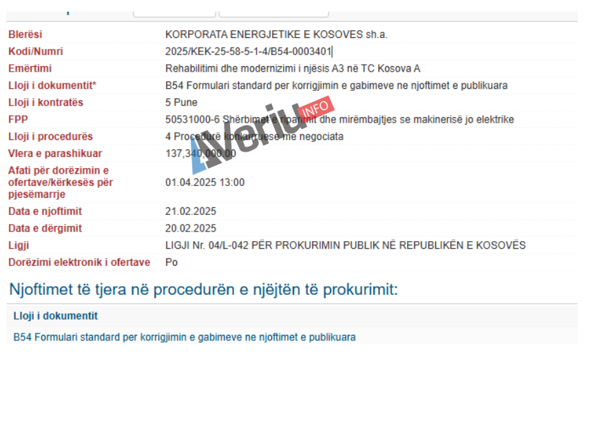 Përmes këtij tenderi synohet Rehabilitimi dhe modernizimi i njësis A3 në TC Kosova A.