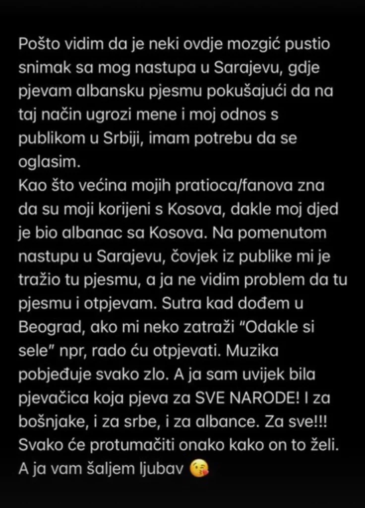 “Pasi që pash se disa mendje të ndritura kanë publikuar videon nga performanca ime në Sarajevë, ku këndova një këngë shqip, duke u përpjekur të më kërcënojnë mua dhe lidhjen me audiencën në Serbi, ndjej se më duhet të reagoj. Siç e dinë shumica e fansave, rrënjët e mia janë nga Kosova, gjyshi im ishte shqiptar nga Kosova”, ka shkruar ajo në rrjete sociale.