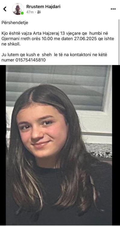 Bëhet fjalë për të miturën Arta Hajzeraj, e cila është zhdukur që nga 27 qershori, në zonën “Lothar-Streit-Straße” të qytetit Zwickau në shtetin gjerman.