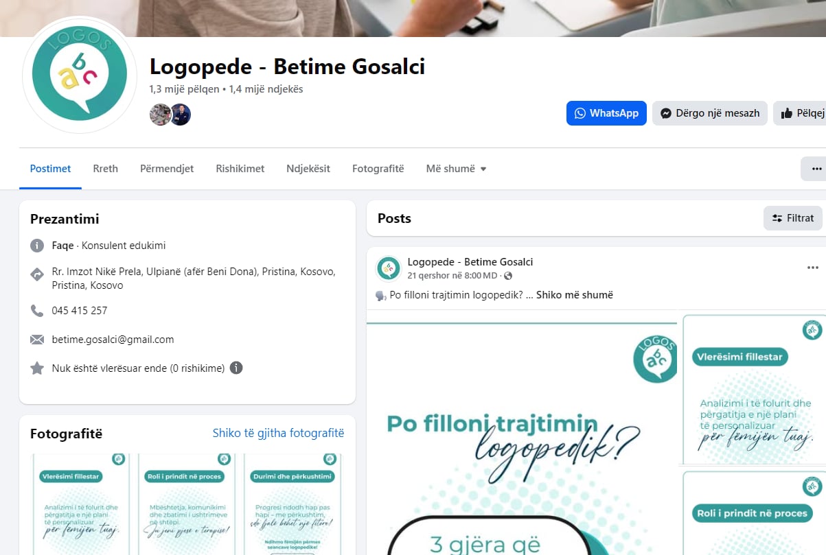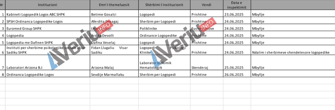 1. Kabineti logopedik Logos ABC SHPK, me themeluese Betime Gosalci, vendi i operimit Prishtinë, lloji i shërbimit logopedi, data e inspektimit 23.06.2025.