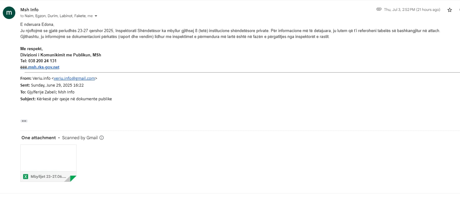 Gazeta Online Veriu.info ka kërkuar qasje në dokumentet zyrtare të ministrisë së Shëndetësisë, ku nga ky institucion fillimisht na është prezantuar vetëm një listë me emrat e institucioneve shëndetësore private të cilat janë mbyllur, duke thënë se vendimet dhe shkresat tjera janë duke u hartuar dhe për momentin nuk mund t’i dërgojnë.