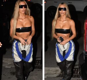 Me një bluzë të vogël, pantallona garash blu dhe të bardhë dhe çizme lëkure të zeza, Kim dëshmoi edhe një herë se është ikonë e stilit dhe dukjes.