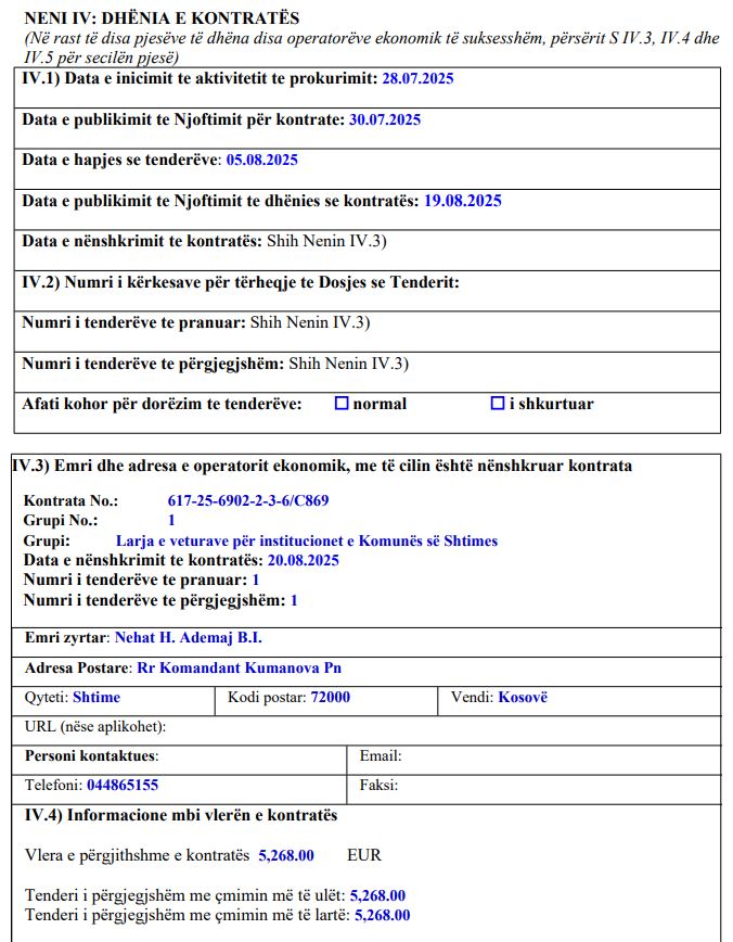 Vlera e parashikuar e këtij tenderi kishte qenë 5,268 euro.