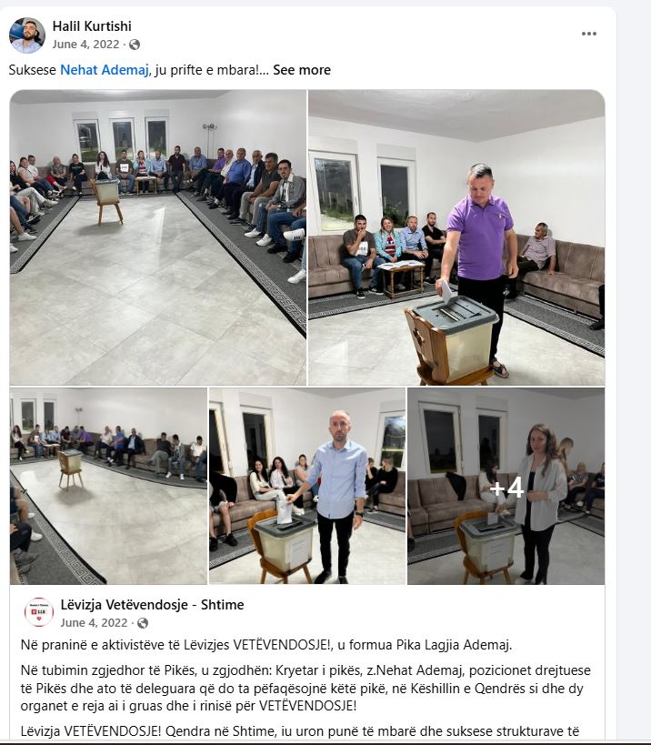 Lëvizja VETËVENDOSJE! Qendra në Shtime, iu uron punë të mbarë dhe suksese strukturave të reja!”, thuhej në një postim në profilin e Ademajt.