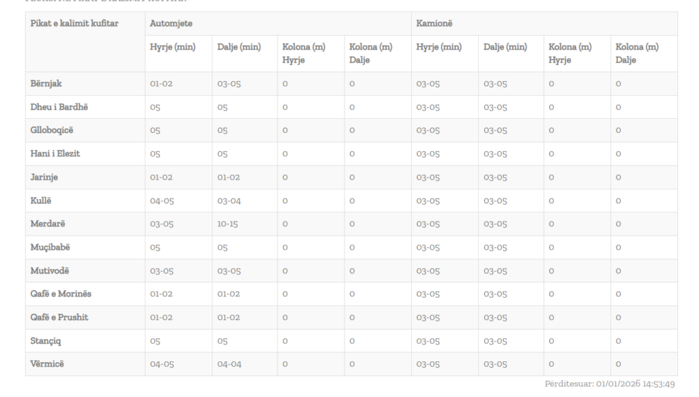 Ministria e Punëve të Brendshme në përditësimin e fundit për gjendjen në pikat kufitare, ka njoftuar se pritjet për të dalë nga Kosova nuk janë më të gjata se 15 minuta, në Merdarë.
