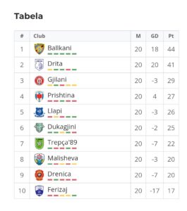 Gjilani renditet në vendin e tretë me 29 pikë, ndërsa skuadra e Prishtinës ndodhet në vendin e katërt me 27 pikë.