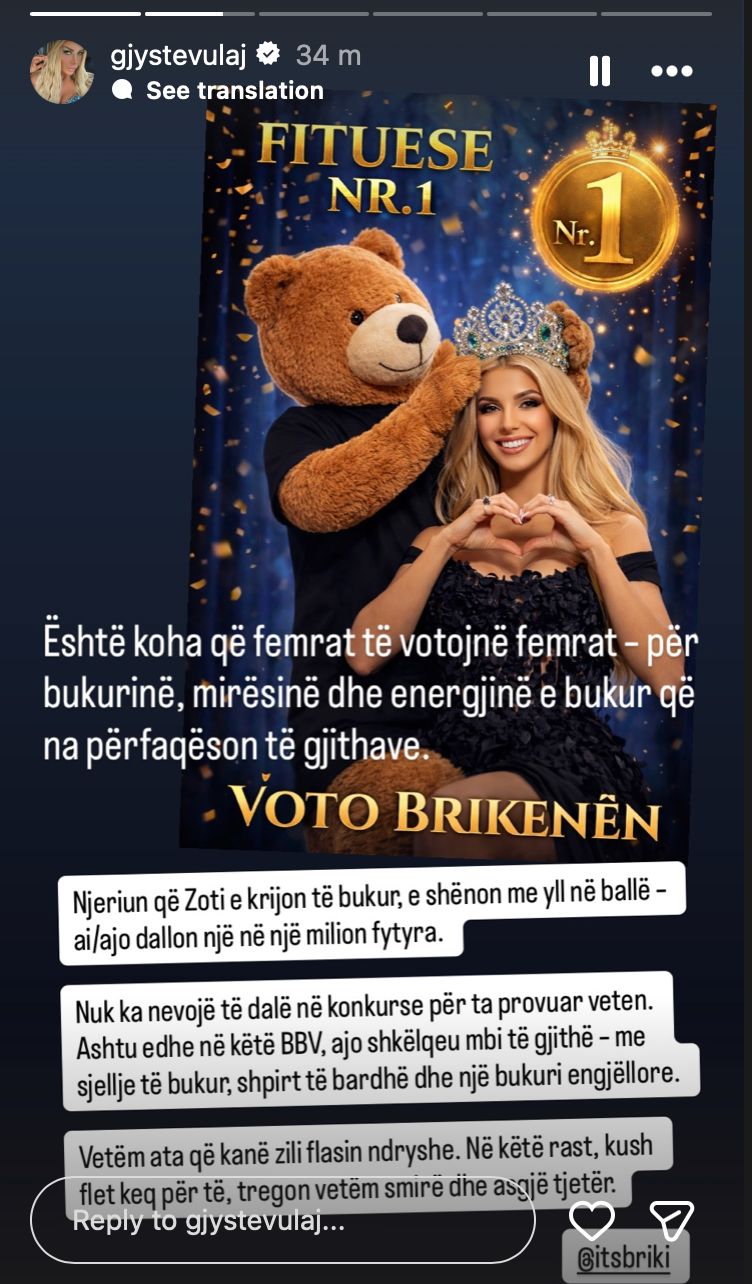 “Është koha që femrat të votojnë femrat – për bukurinë, mirësinë dhe energjinë e bukur që na përfaqëson të gjithave. Voto Brikenën”, ka shkruar Gjystja, duke bërë thirrje që rrugëtimi i saj të mos ndalet këtu.