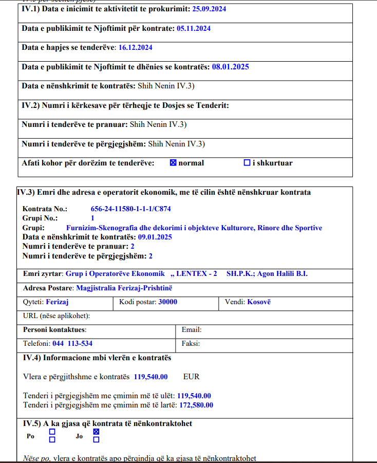 Komuna e Ferizajit me 9 janar kishte nënshkruar një kontratë, për “Furnizim-Skenografia dhe dekorimi i objekteve Kulturore, Rinore dhe Sportive”.