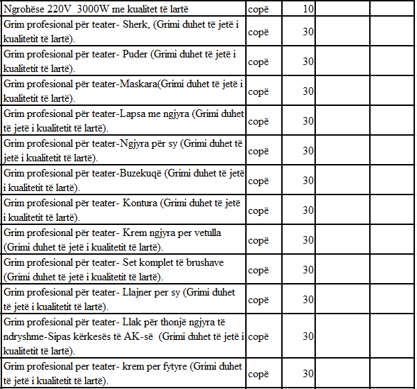 Në mesin e përshkrimit të artikujve që kërkohen, sa i përket Skenografisë dhe dekorimit të objekteve Kulturore, Rinore dhe Sportive, janë listuar edhe produkte të ndryshme të kozmetikës, si: Sherk, puder, maskara, lapsa për sy, buzëkuqë, kontura, etj.