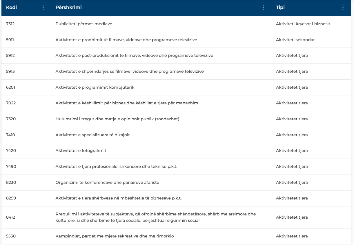Aktivitet kryesor i kompanisë është “Publiciteti përmes mediave”. Ndërsa aktivitet sekondar e kanë “aktivitetet e prodhimit të filmave, videove dhe programeve televizive”.