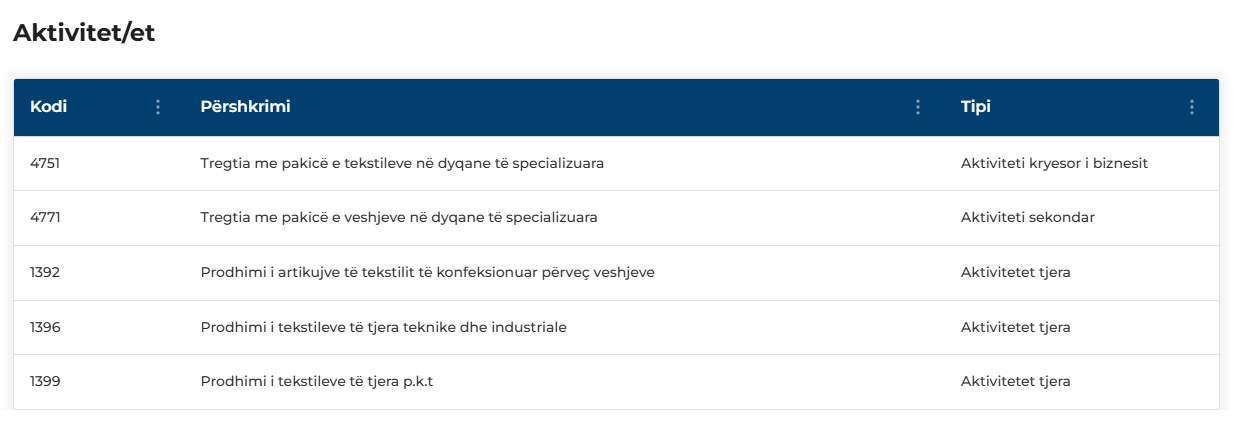Poashtu sipas ARBK, kompania tjetër fituese LENTEX Sh.P.K aktivitet kryesor e ka “Tregtia me pakicë e tekstileve në dyqane të specializuara”.