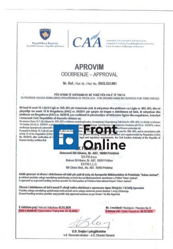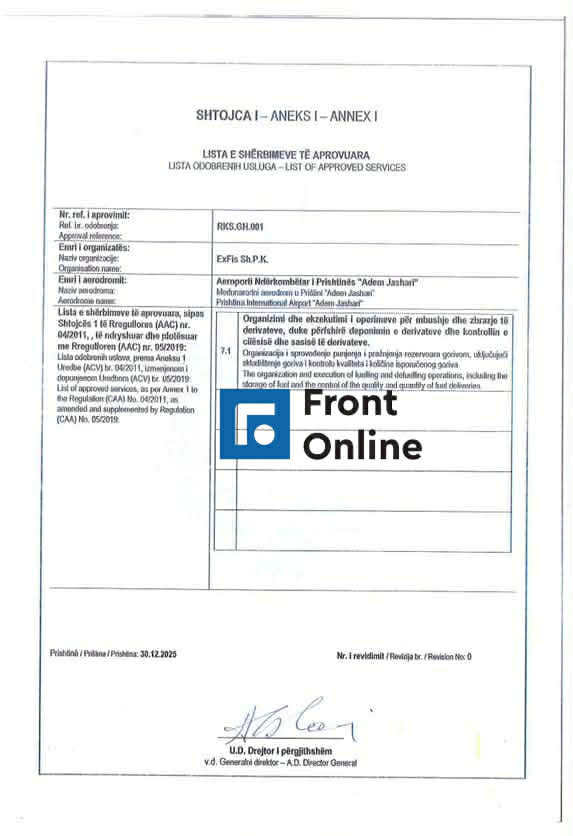 Sipas dokumenteve që posedon portali Front Online vendimi është nënshkruar nga u.d i drejtorit të Autoritetit të Aviacionit Civil të Kosovës, Arianit Islami, më 30 dhjetor 2025, ku ceket se kompania EXFIS Sh.P.K është aprovuar si ofrues i shërbimeve për tokë për palë të treta në Aeroportin Ndërkombëtar të Prishtinës.