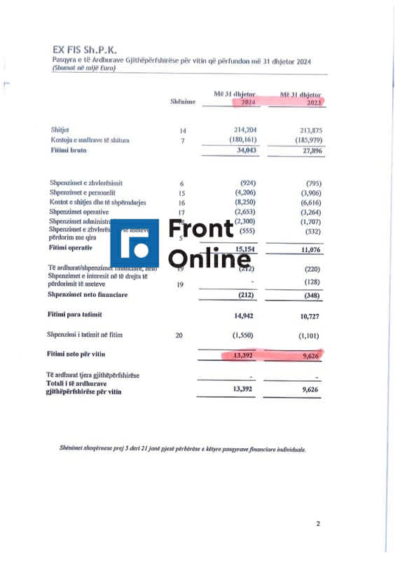 Sipas pasqyrave financiare të kompanisë “EXFIS” për vitin 2024, kjo e fundit ka deklaruar rreth 13.5 milionë euro fitim neto, përderisa fitimi i saj neto në vitin 2023 kishte qenë 9.6 milionë euro.