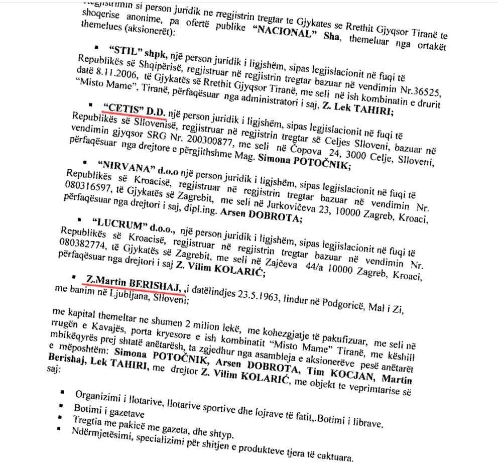 Mediat kanë raportuar se Martin Berishaj, është hisedar me 10 % të aksioneve në firmën Nacional (Shqipëri), ku në fillimet e saj, ishin katër firma aksionare të tjera: ‘Stil’, ‘Cetis’, ‘Nirvana’ dhe ‘Lucrum’, me pronarë sllovenë e kroatë.