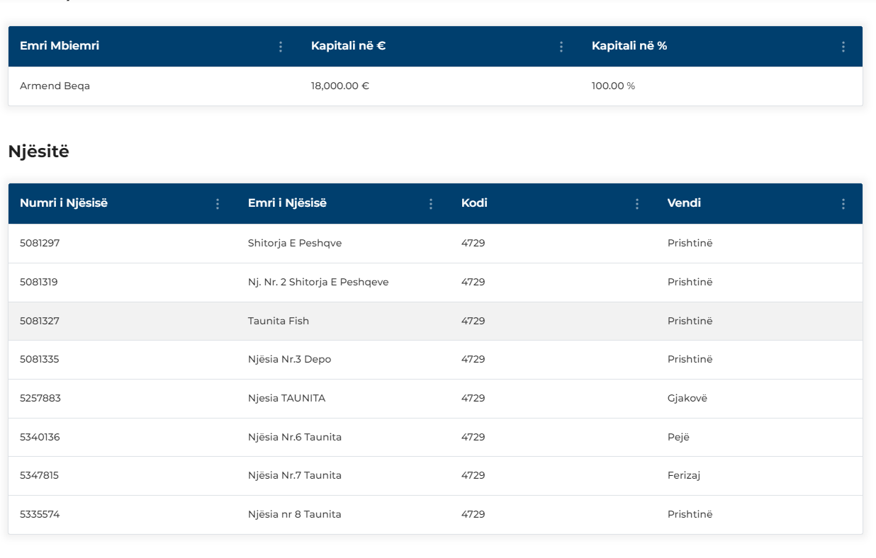 Ndryshe, “Taunita” Sh.P.K. me pronar Armend Beqa, ka edhe tetë (8) njësi të kompanisë, të cilat funksionojnë si: Shitorja E Peshqve, Nj. Nr. 2 Shitorja E Peshqeve, Taunita Fish, Njësia Nr.3 Depo, Njesia TAUNITA, Njësia Nr.6 Taunita, Njësia Nr.7 Taunita, Njësia nr 8 Taunita.